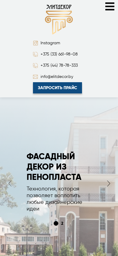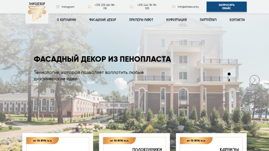 | AI-анализ | The web project "Elitdecor.by" is a Belarusian e-commerce website selling exterior decorative elements made of expanded polystyrene (XPS) for residential and commercial properties. The website offers a wide range of products, including facade decor, moldings, cornices, colonnades, architraves, and various additional elements. All products come with a quality guarantee from the manufacturer and are delivered throughout Belarus. The website provides detailed product information, prices, and specifications, as well as an option to request a quote. The company's portfolio includes various projects, such as sanatoriums, shopping centers, cottages, and consultations. Potential clients are encouraged to leave their contact information to receive a call back from a specialist. The website's advantages include high-quality and affordable products, the ability to create custom orders, timely delivery, and assistance in selecting |