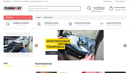 | AI-анализ | The website is an e-commerce platform selling various types of car films and auto accessories in Brest and Minsk, Belarus. The offered products include carbon fiber films, anti-gravel films, removable toning films, and films for car mirrors. The website boasts a wide selection of materials for automotive vinyl and accessories, with delivery available throughout Belarus. The top keywords are 'pленка' (pленка, or 'plenka', meaning 'film' or 'plate'), 'фар' (far), and 'тонировка' (toning). The homepage features information on the company's services, such as car film application, car mirror protection, car polishing, and car tinting. Other categories include auto accessories, car care, and optics. The website also provides a blog for customers, as well as a client support system and |