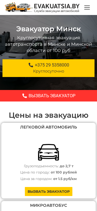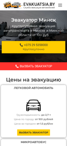 | AI-анализ | This online resource is a website for an around-the-clock evacuation service based in Minsk, Belarus. The title of the website is "Эвакуатор Минск круглосуточно - Эвакуатор Минск" (Evakuator Minsk Kruglyosutchnо - Evakuator Minsk). The main keywords associated with the site include "эвакуатор" (evacuator), "минск" (Minsk), "минске" (in Minsk), "автомобиль" (car), and "эвакуации" (evacuation). The website offers evacuation services for various types of vehicles, including cars, microbuses, motorcycles, and special equipment, with weights ranging from 0.5 to 5 tons. The prices for evacuation |