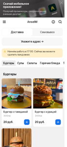 | AI-анализ | This online resource is titled "AnselM Поставы" and is associated with the domain name anselm.by. The website offers a menu for food and beverage items, with options for burgers, soups, salads, hot dishes, tapas, pastas, and various sauces and sides. Prices are listed for each item, such as 20 rubles for a burger with chicken or beef, 12 rubles for a cup of soup, and 15 rubles for a Caesar salad with chicken or shrimp. Some dishes come with options for different sizes or add-ons, like a 300 gram steak from the loon for 28 rubles or a pasta carbonara for 18 rubles. The website also mentions options for delivery and self-pickup, and includes a phone number for ordering. The menu may vary |