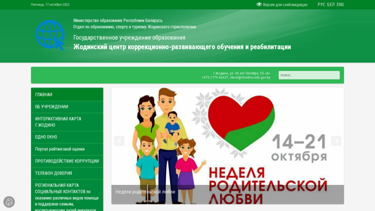| AI-анализ | The web project "Жодинский центр коррекционно-развивающего обучения и реабилитации" is a government educational institution located in the city of Жодино, Belarus, at ul. 40 лет Октября, 53 "А". The project focuses on corrective and developmental education and rehabilitation. The website contains information on various events, including a parent meeting on October 7, 2025, and a campaign against zero trauma from September 22 to 26, 2025. There are also mentions of a rating evaluation portal, a health city project, and a hotline for child protection. The title of the project is "Жодинский центр коррекционно-развивающего обучения и реабилитации" and it can be |