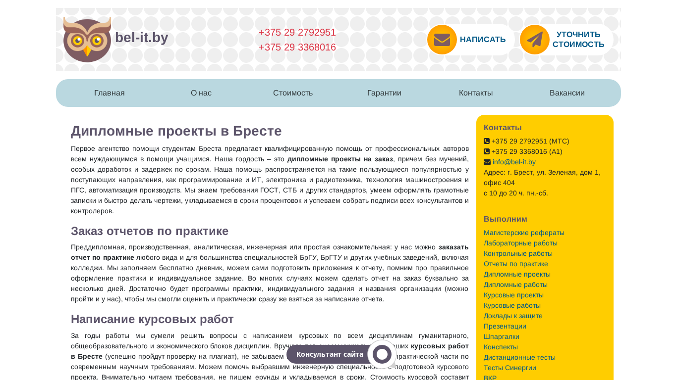 | SEO-описание | Приближается сессия или рабочая комиссия? Помогаем инженерам и не только с их дипломными проектами и работами, курсовыми, контрольными и отчетами по практике. Помощь учащимся из Бреста с гарантией. Качественно, быстро, только опытные специалисты. |