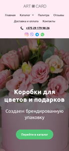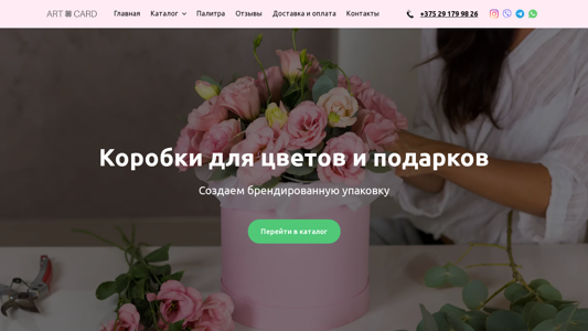 | AI-анализ | --- The web project "Коробки для цветов и подарков" (Art-Card.by) is an online catalog for various box shapes and sizes for flowers and gifts. The site offers krugely (round), budget-friendly, pryamougolnye (rectangular), and heart-shaped boxes, as well as see-through, seven-pointed star, and transport boxes. Additionally, the site features branded ribbons, logo printing, and delivery services. The company, which has been producing premium-quality packaging for over five years, serves both Belarusian and international markets, including the United Kingdom, United States, Germany, France, Belgium, Netherlands, Poland, Lithuania, Latvia, Canada, Singapore, and Tenerife (Spain). The site allows customers to choose from various box sizes and shapes, extensive color palettes, and various materials |