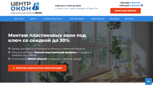 | AI-анализ | The website is a retailer for PVC windows under the brand REHAU in Minsk, Belarus. It is an official partner of REHAU and offers a range of PVC windows, doors, and systems including sliding, patio, and French doors. The website provides consultation and individual solutions. Products include double and triple glazed windows, balcony frames, laminated, sun protection, energy saving, and mirror windows. Additionally, there are panoramic and French windows in full height. The website also sells various systems, such as those for patios and premidoor, as well as Schüco doors and aluminum windows with sliding systems. The website offers a montage service for plastic windows with a discount up to 30% on measuring, delivery, and installation in Minsk and the region. The contact information for the company is provided, including phone numbers. The website features a |
