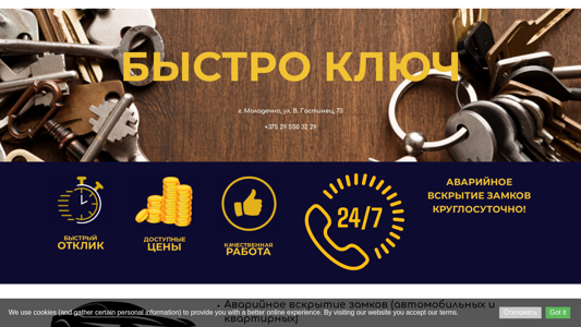 The portal Fastkey.by is a locksmith service in Minsk, Belarus, specifically located at ul. V.Gostinec, 73 in the Molodechno district. The website offers various services related to locksmithing, including emergency lock opening for both residential and automotive applications, key repair and replacement, key manufacturing, and various additional services such as button sewing, zipper repair, and lamp repair. The company operates Monday through Friday from 10:00 to 18:00 and on weekends only in the Molodechno district, as well as in Volozhin, Radishkovichi, Smorgon, Vileyka, Minsk, and other towns in the region. Customers can contact the company through phone numbers +375 (29) 550 32 29 or +375 (25