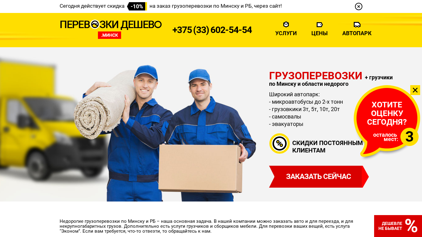 | SEO-описание | «Перевозки Дешево» - заказать недорогие грузоперевозки и переезды в Минске и области грузовым автомобилями за 17 рублей в час! Звоните ☎️ +375 (33) 602-54-54 |