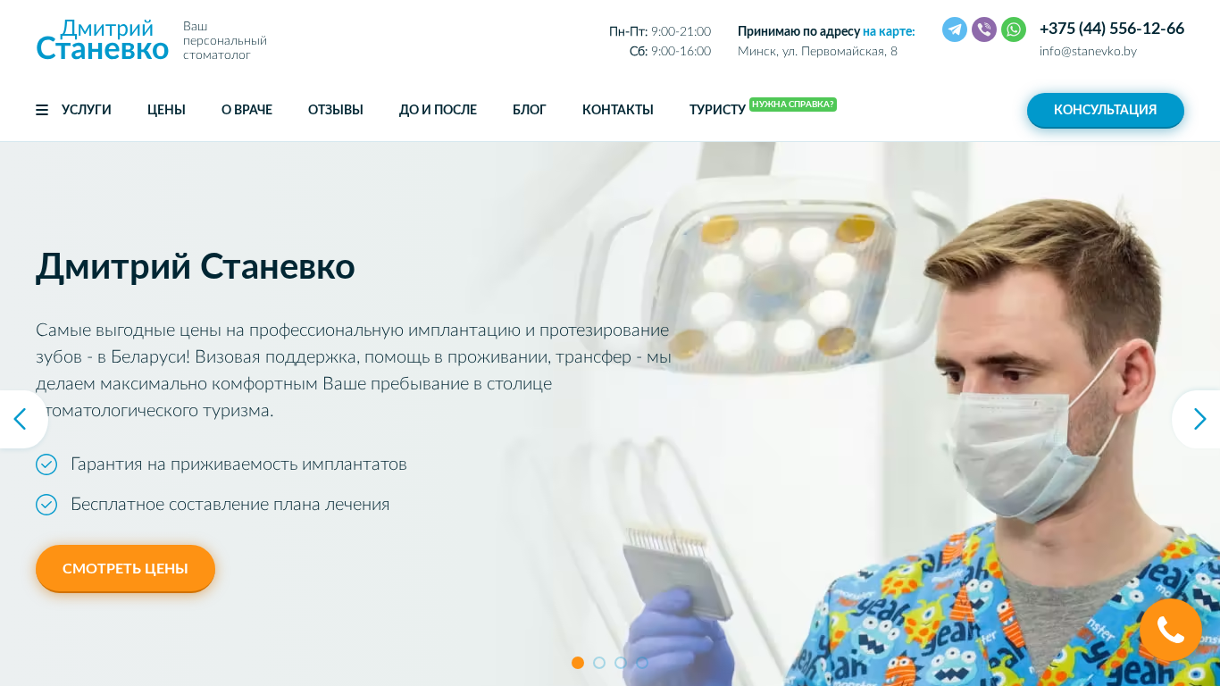 | SEO-описание | Частный стоматолог Дмитрий Станевко - Профессиональное восстановление идеальной улыбки в Минске. Опыт более 12 лет. Более 20 сертификаций. Два вида гарантии на имплантацию. Запись в стоматологию на сайте! |