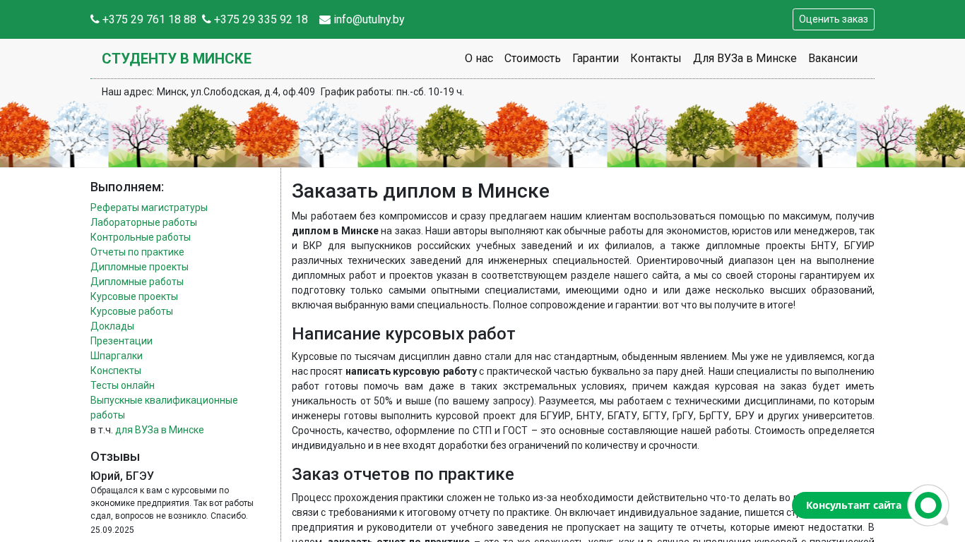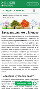| AI-анализ | The portal offers various services for students in Minsk, including completing tests and solving control tasks, writing term papers and reports on practical work, and providing diplomas. The full range of services is available for both higher and specialized education. It assists students in colleges as well. The quality and guarantees are emphasized. Keywords include 'order, diploma, diploma projects, Minsk, writing, term papers, reports on practical work, control tasks, tests, solutions, completion'. The top words are 'works', 'practical', 'term papers', 'diplomas', 'projects', 'Minsk', 'orders', 'services'. The contact information includes phone numbers and an email address. The site's address and working hours are also provided. The portal ensures maximum assistance for students in Minsk by offering help with various academic tasks, including diplomas for engineering specialties from BNT |