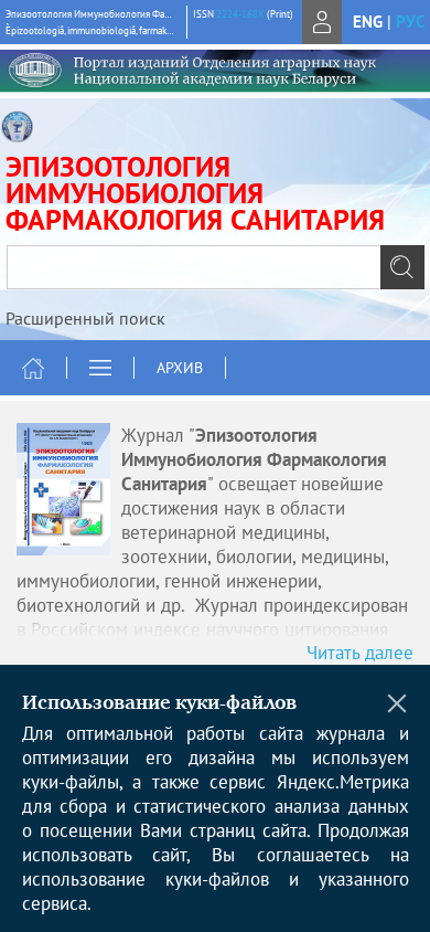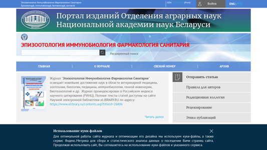 | AI-анализ | The website is the official homepage for the scientific peer-reviewed journal "Эпизоотология Иммунобиология Фармакология Санитария" (Epizootology, Immunobiology, Pharmacology, Hygiene) in Belarus. The journal covers the latest advancements in veterinary medicine, zootechnics, biology, medicine, immunobiology, genetics, bioengineering, and related fields. It is indexed in the Russian Science Citation Index (RSCI). Full texts of articles are available on the Scientific Electronic Library eLIBRARY.RU. The homepage provides access to current and archived issues, author guidelines, and subscription information. It also features a search function and a link to the journal's editorial board and editorial committee. The top words on the website include "при |