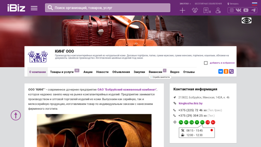 | Название / Заголовок | КИНГ ООО - Производство кожгалантерейных изделий из натуральной кожи. Деловые портфели, папки, сумки мужские, сумки женские, портмоне, кошельки, обложки на документы. Швейное производство. Изготовление швейных изделий под заказ.. 213822, Бобруйск, , Минская, 142А, к. 46 |