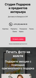 | AI-анализ | This website is an online photography printing service based in Belarus, offering photo prints on canvas for delivery throughout Belarus. The title of the website is "Фото на холсте - Печать картин и портретов на заказ," and the description states that customers can order custom-made prints within a day with delivery across Belarus. The website's top keywords include "photo on canvas," "print on canvas," "flip art," and "flip flop," suggesting that the studio also offers unique, artistic prints. The website also mentions that they work without upfront payment and offer various sizes and prices for their canvas prints. |