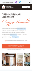 | Название / Заголовок | Премиальная квартира в центре Минска | Удобное расположение в историческом районе, сочетание богатого наследия и современных удобств. Наслаждайтесь комфортоми престижем жизни в самом красивом городе Беларуси. |