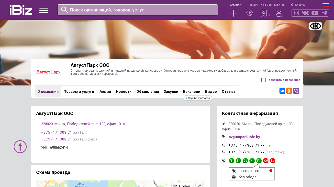 | AI-анализ | The website is a business-to-business platform for August Park OOO, a company located in Minsk, Belarus, specializing in the wholesale trade of dairy and food products, canned goods, as well as the sale of animal feed and feed additives (sunflower and soybean shrot, corn dried yeast). The site provides details on company location, contact information, and trading hours. It features a section for announcements of new offers and promotions, as well as a section for news and vacancies. The site also includes a map to help visitors reach the company's office. |
