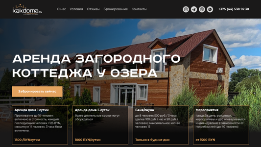 | AI-анализ | --- The portal kakdoma.by offers a cottage for rent by the lake in the Logoyskiy district, with a sauna and a large area for games and relaxation. It can accommodate up to 14 people. The cost includes accommodation for 10 people, with each additional person costing an extra 125 BYN. The cottage is available for rent for one day, with longer stays negotiable for 1000 BYN per day. The sauna can accommodate up to 8 people and costs 500 rubles for 3 hours, with additional costs per hour and person. The cottage is only available for rent on weekdays, and group events (such as weddings, birthdays, and corporate events) are handled on a case-by-case basis for up to 40 people, starting at 1500 BYN. The cottage is a |