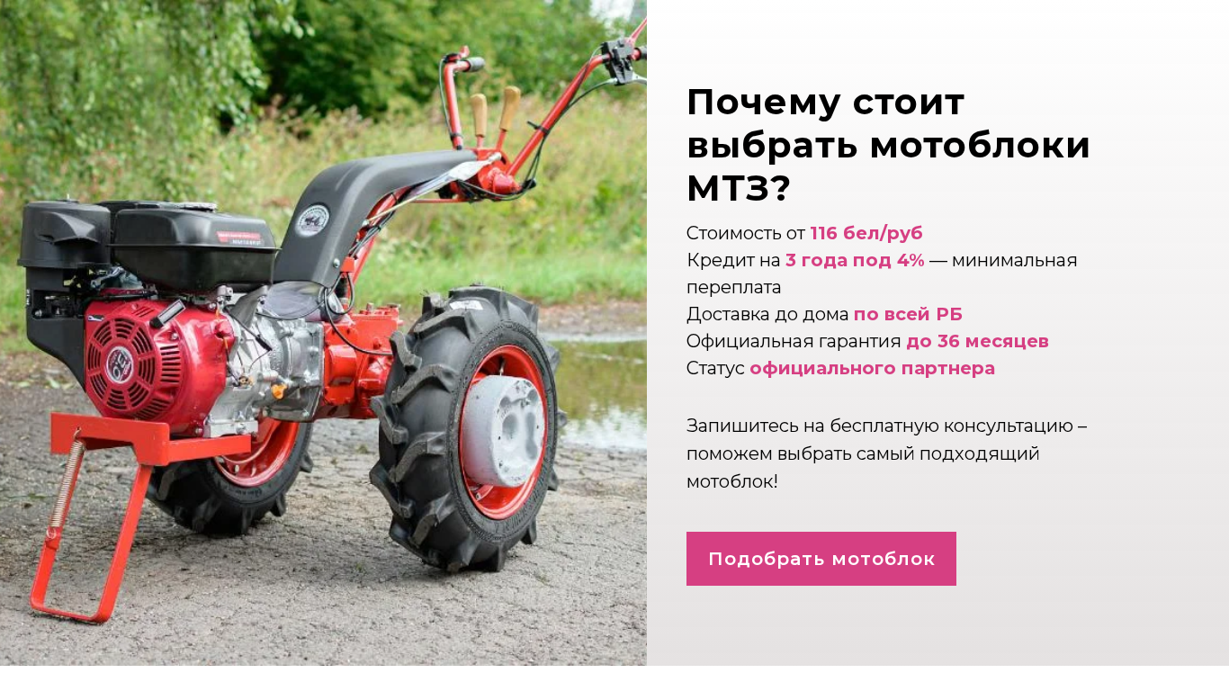 | AI-анализ | The portal Motobloktut.by offers visitors assistance in selecting a MTZ branded motorblock based on their specific needs and budget. The website provides detailed information about various models, including their power and recommended land area, as well as an option for a free consultation with a manager. Prices for MTZ motorblocks start from 116 BYB/BYR, with a credit offer available for up to 3 years at 4% interest. Delivery to the customer's home is included in the offer, and all products come with an official warranty of up to 36 months. Popular models on the site include the Weima WM177F, Motobлок MTZ Belarus 09H-02, and Weima 188F, each with different power outputs and recommended land areas. Users can answer a few questions to receive a |