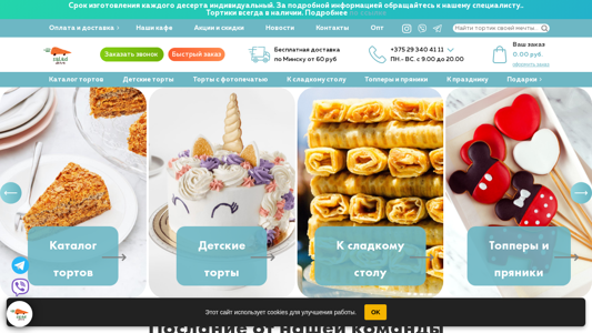| AI-анализ | This website is an online cake shop named Salad Drive, based in Minsk, Belarus. The shop offers customers to buy cakes with delivery options or to pick up orders at any of their stores. Prices for cakes are low. The shop has a phone number for orders and inquiries, as well as an Instagram account for customers to contact. Cakes are available for various occasions and come with toppers and pries. Delivery is free within Minsk for orders above a certain amount. The website also offers a catalog of cakes, coffee, and other related products for purchase. Orders can be placed online and paid for through multiple methods. The shop also has a section for special offers, news, and contacts for opt-in customers. The shop's hours of operation are listed as Monday through Sunday, from 9:00 AM to 8:00 PM. The website is |
