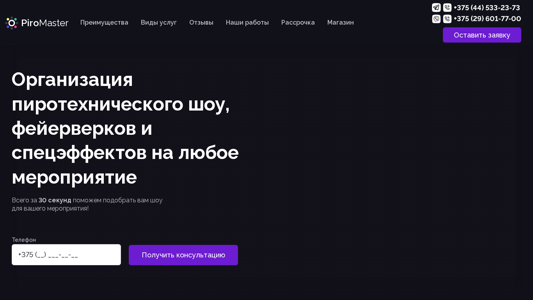 | AI-анализ | --- The portal Piromaster is a professional pyrotechnics show organizer in Minsk, Belarus. They offer fireworks shows and special effects for any event. With over a decade of experience, thousands of satisfied clients, and a team of experts, they create unique and spectacular shows tailored to each client's preferences. Safety is a priority, with only certified and high-quality pyrotechnics used. The service is mobile and operates throughout Belarus. Quick response and large team ensure shows can be held even on short notice. Affordable prices offer quality pyrotechnics at reasonable costs. Services include cold fire fountains for indoor or outdoor use and fireworks displays. |