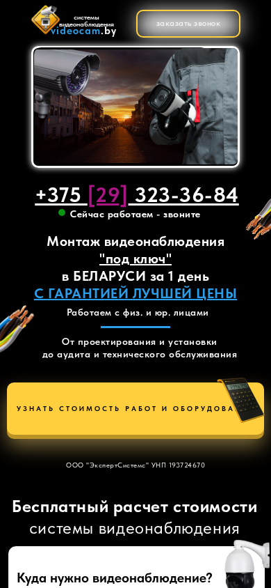 | AI-анализ | The website videocam.by is dedicated to video surveillance installation services in Belarus. The title of the website is "установка видеонаблюдения" (installation of video surveillance) in Russian. The most frequent keywords on the website include "installation," "camera," "video," "monitoring," and "security." The website also contains information about the company, MV System, which provides the installation services, along with their contact information and a promise of the best price. The website offers a free quote for video surveillance systems and caters to various types of clients, including residential, commercial, and industrial properties. The website features images of surveillance cameras and systems, and users can make inquiries about installing a security system in various locations, such as homes, offices, or parking lots. The company has over 10 years of experience and offers a five-year guarantee on installation work. |