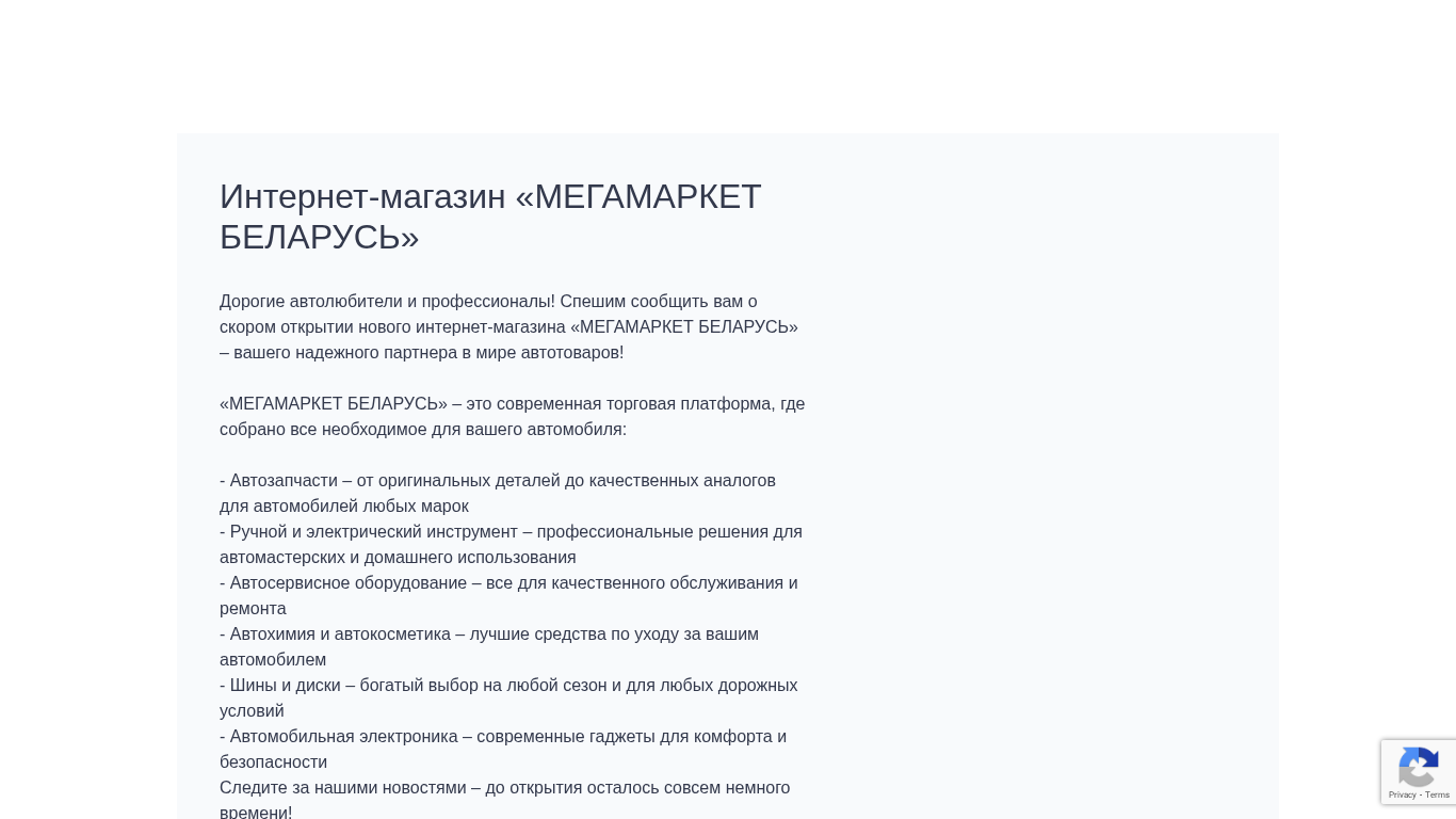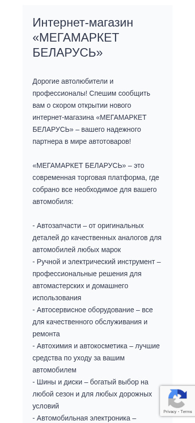| SEO-описание | Дорогие автолюбители и профессионалы! Спешим сообщить вам о скором открытии нового интернет-магазина «МЕГАМАРКЕТ БЕЛАРУСЬ» – вашего надежного партнера в мире автотоваров! «МЕГАМАРКЕТ БЕЛАРУСЬ» – это современная торговая платформа, где собрано все необходимое для вашего автомобиля: - Автозапчасти – от оригинальных деталей до качественных аналогов для автомобилей любых марок - Ручной и электрический инструмент – профессиональные решения для автомастерских и домашнего использования - Автосервисное оборудование – все для качественного обслуживания и ремонта - Автохимия и автокосметика – лучшие средства по уходу за вашим автомобилем - Шины и диски – богатый выбор на любой сезон и для любых дорожных условий - Автомобильная электроника – современные гаджеты для комфорта и безопасности Следите за нашими новостями – до открытия осталось совсем немного времени! МЕГАМАРКЕТ БЕЛАРУСЬ – все для вашего автомобиля в одном месте! |
