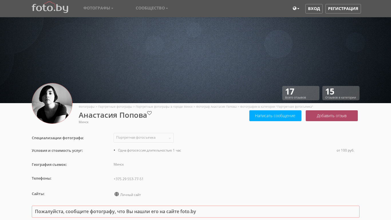 | SEO-описание | Фотографии в категории "Портретная фотосъемка". Сайт фотографа Anastasiya Popova. Я работаю как портретный фотограф в Минске и с выездом в любой другой город. |