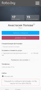 | AI-анализ | This website belongs to photographer Anastasiya Popova from Minsk, Belarus. The main focus of the site is on portrait photography. Anastasiya offers her photography services both in Minsk and for travel to other cities. The site includes a catalog of her work in the portrait category and information about her services and pricing. There are also links to her personal site and contact information including a phone number. The site has received 15 reviews with a focus on portrait photography. The photographer's specialization is in portrait photography and her services include one hour long photo sessions starting at 100 rubles. The site is part of the foto.by network and includes a link to the community of photographers on the site. |