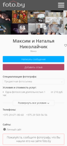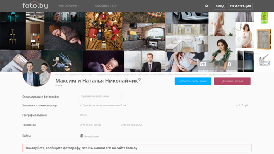 | AI-анализ | The portal nik.foto.by is a photography website featuring the works of photographers Maxim and Natalia Nikolaichik from Minsk, Belarus. The website offers various photography services including product photography, event photography, interior photography, and studio photography in cities such as Minsk, Grodno, and Mogilev. The site also includes a community of photographers and a blog. The main page of the site displays the catalog of photographers, while the community of photographers can be accessed through a separate tab. The website has over 113,000 photos in various categories and received 63 reviews. The photographers offer one photography session lasting one hour for 210 rubles. They specialize in product photography, event photography, and photography of newborns. The website is accessible via the phone numbers +375 29 671- |