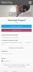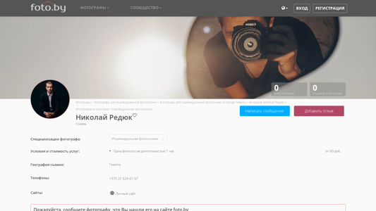| AI-анализ | The website is that of photographer Nikolai Redyk from the city of Homel, Belarus. It features photographs in the category of 'Individual Photo Shoots'. The photographer offers his services as a photographer in Homel. The website is part of the foto.by photo community and includes a catalog of photographers, community area, blog, and contact information. The photographer specializes in individual photo shoots, as well as thematic and event photography. The pricing for his services starts at 60 rubles per hour for one photo session. The website includes a portfolio of his work, as well as customer reviews. The site is available in both Russian and Belarusian languages. |