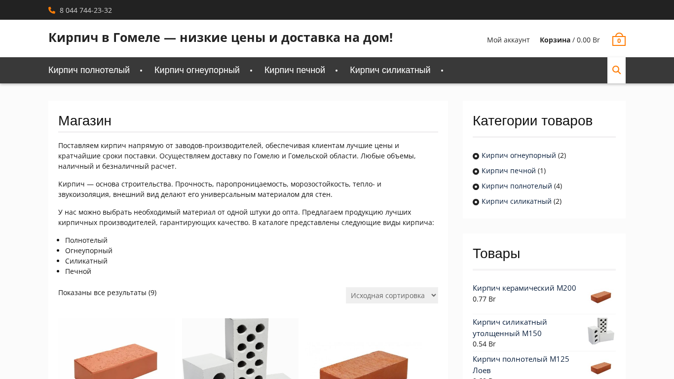 SEO-описание | Кирпич оптом и в розницу. Огромный выбор, всегда в наличии. ✓ Цена от производителя. ✓ Оперативная доставка. ✓ Без лома и сколов. Успей купить ☎ +375(44)744-23-32 |