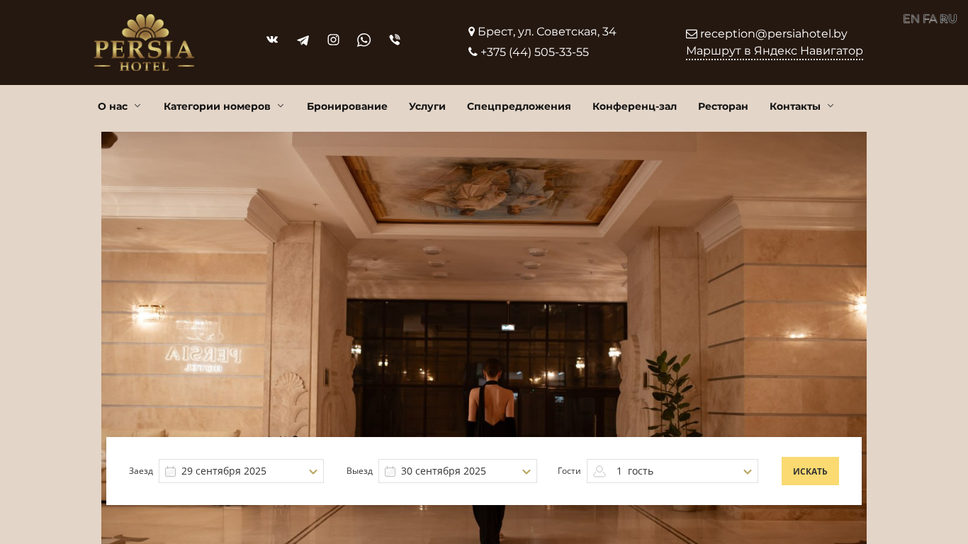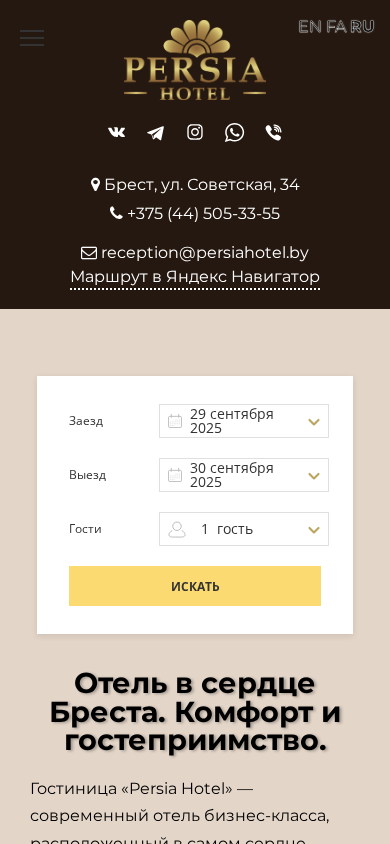 SEO-описание | Добро пожаловать в гостиницу «Persia Hotel» - оазис элегантности в центре Бреста. Мы предлагаем уникальный комфорт, изысканные номера и высочайший уровень обслуживания для каждого гостя. |