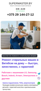 SEO-описание | Ремонт стиральных машин в Витебске — выезд мастера на дом, замена подшипников, тэна, модуля, платы, резинок, устранение протечек, ошибок и т.д. Ремонт стиральной машины Атлант, LG, Indesit, Samsung, Bosch, Электролюкс и других брендов. Мастер по ремонту стиральных машин с опытом 12 лет. Цены от 25 рублей. Звоните ☎️ +375 29 144-27-12. Супер Мастер |