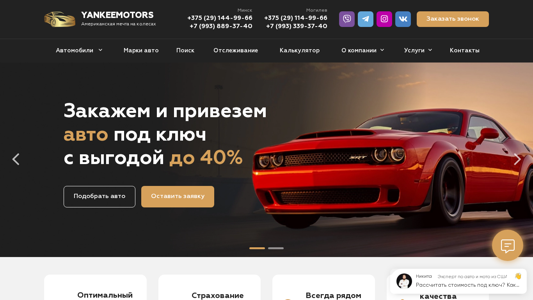 SEO-описание | ЯнкиМоторс поможет подобрать, купить и пригнать автомобиль из США, Южной Кореи, Китая, Западной Европы в Беларусь и Россию "под ключ" на заказ. С мировых аукционов и площадок. На выгодных условиях. Официальный договор. Без посредников. |