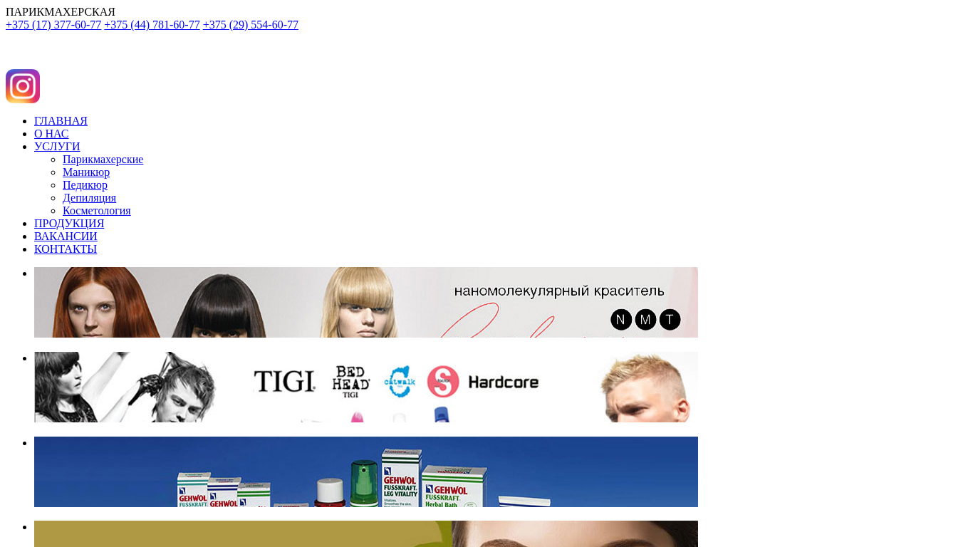 Ключевые слова | парикмахерские услуги стрижка маникюр педикюр укладка окрашивание моделирование колорирование уход за ногтями маски Revlon OPI TIGI Gehwol Keune салон-парикмахерская Мила Минск Беларусь |