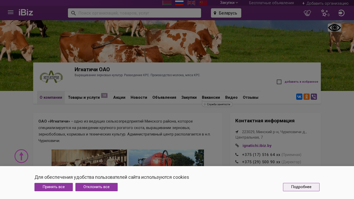 Название / ЗаголовокИгнатичи ОАО - Выращивание зерновых культур. Разведение КРС. Производство молока, мяса КРС.. 223029, , Чуриловичи д., Центральная, 7
