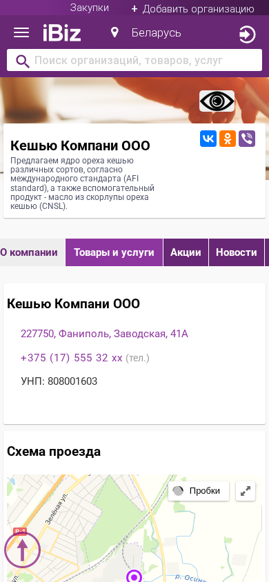 Название / Заголовок | Кешью Компани ООО - Предлагаем ядро ореха кешью различных сортов, согласно международного стандарта (AFI standard), а также вспомогательный продукт - масло из скорлупы ореха кешью (CNSL).. 227750, Фаниполь, , Заводская, 41А |
