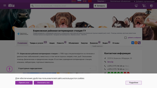 Название / Заголовок | Борисовская районная ветеринарная станция ГУ - Предупреждение и ликвидация заразных и незаразных заболеваний животных (включая пушных зверей, рыб, пчел) . Помощь мелким, крупным животным. Лабораторные исследования. Продажа ветпрепаратов. Обрезка копыт. УЗИ КРС.. 222514, Борисов, , Ибаррури, 20 |