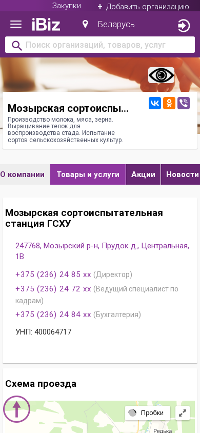 Название / ЗаголовокМозырская сортоиспытательная станция ГСХУ - Производство молока, мяса, зерна. Выращивание телок для воспроизводства стада. Испытание сортов сельскохозяйственных культур.. 247768, , Прудок д., Центральная, 1В