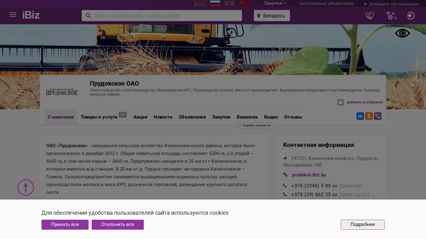 Название / Заголовок | Прудокское ОАО - Животноводство и растениеводство. Выращивание КРС. Производство молока. Мясо от производителя. Выращивание продукции от растениеводства: пшеница, кукуруза, семена.. 247721, , Прудок д., Молодежная, 100 |