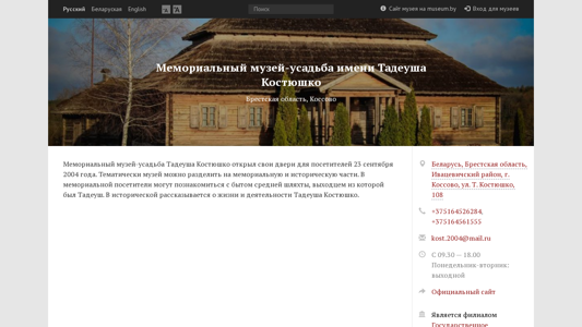 SEO-описание | Мемориальный музей-усадьба имени Тадеуша Костюшко — новости и афиша мероприятий, информация для посетителей, цены, экспозиция, коллекции, материалы для музейщиков. |