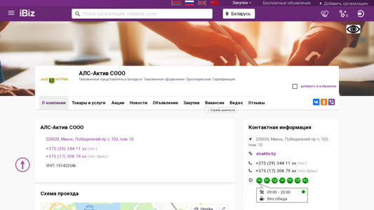Название / Заголовок | АЛС-Актив СООО - Таможенный представитель в Беларуси. Таможенное оформление. Грузоперевозки. Сертификация.. 220020, Минск, , Победителей пр-т, 103, пом. 10 |