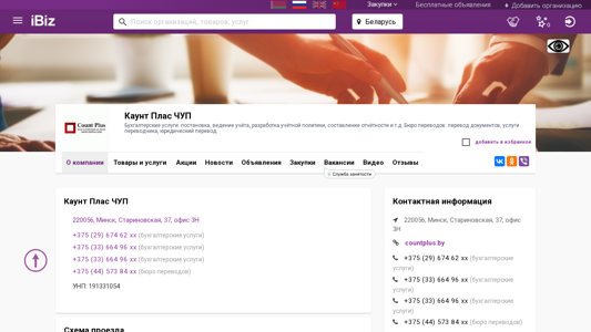 Название / Заголовок | Каунт Плас ЧУП - Бухгалтерские услуги: постановка, ведение учёта, разработка учётной политики, составление отчётности и т.д. Бюро переводов: перевод документов, услуги переводчика, юридический перевод. . 220056, Минск, , Стариновская, 37, офис 3Н |