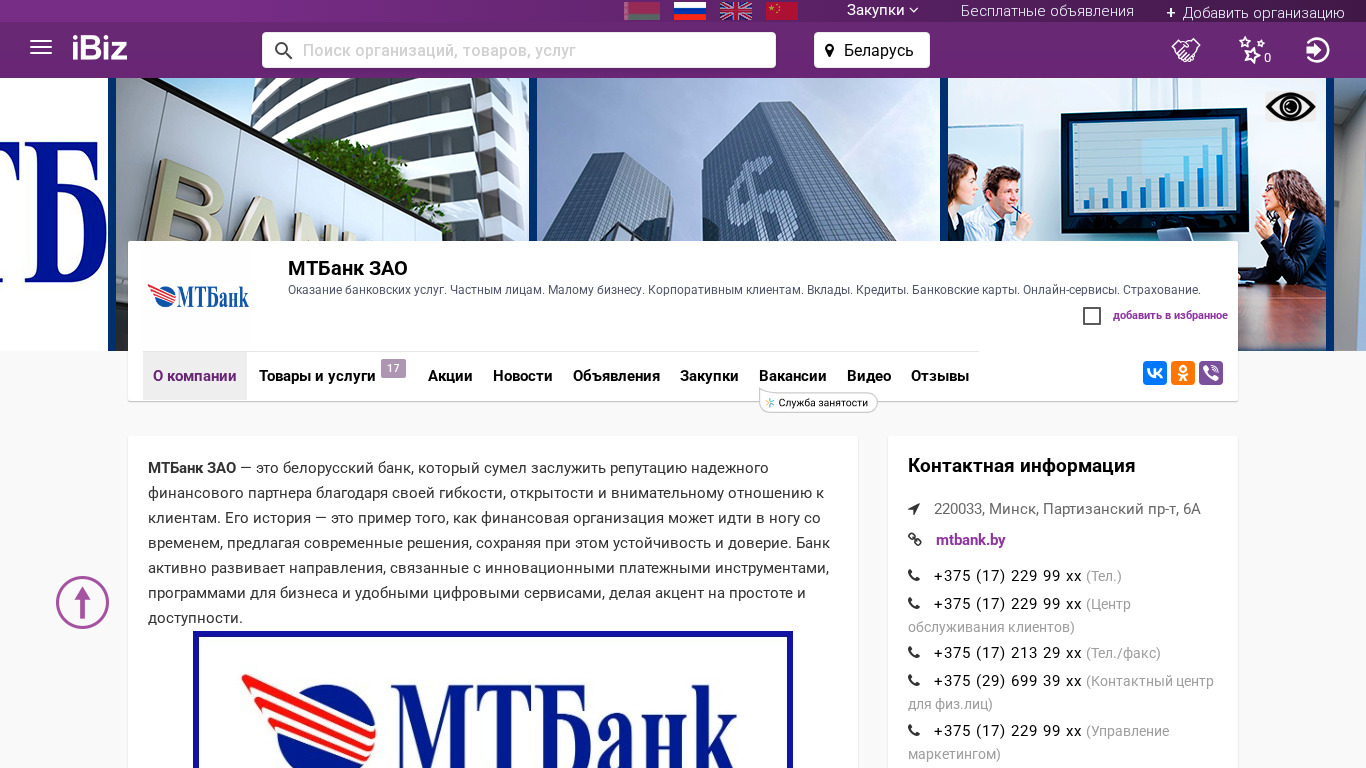 Название / Заголовок | МТБанк ЗАО - Оказание банковских услуг. Частным лицам. Малому бизнесу. Корпоративным клиентам. Вклады. Кредиты. Банковские карты. Онлайн-сервисы. Страхование.. 220033, Минск, , Партизанский пр-т, 6А |