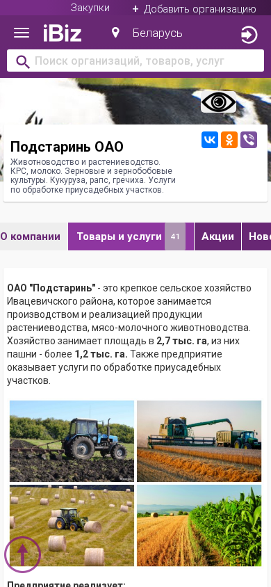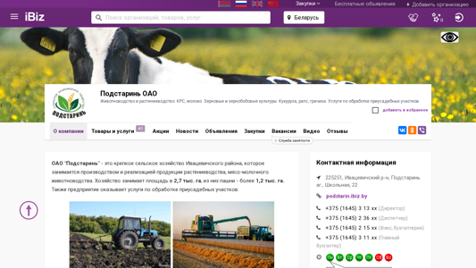 Название / Заголовок | Подстаринь ОАО - Животноводство и растениеводство. КРС, молоко. Зерновые и зернобобовые культуры. Кукуруза, рапс, гречиха. Услуги по обработке приусадебных участков.. 225251, , Подстаринь аг., Школьная, 22 |