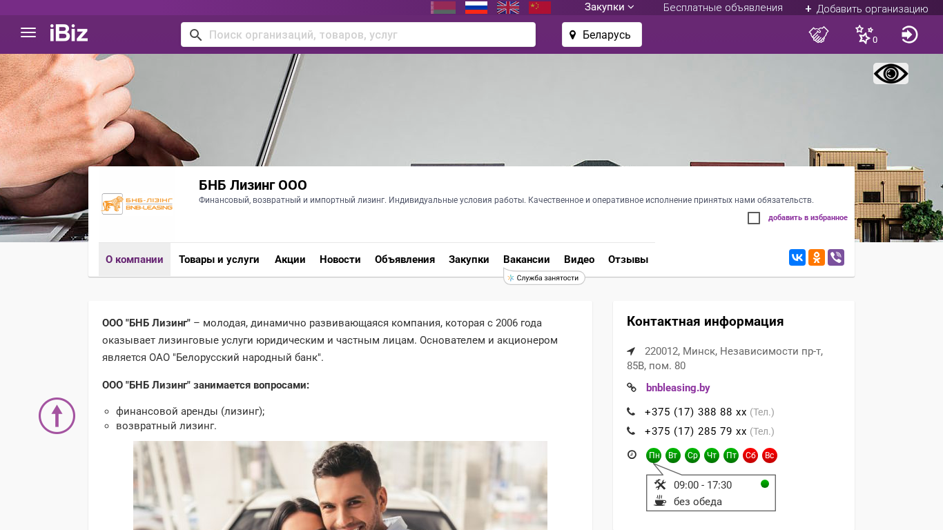Название / Заголовок | БНБ Лизинг ООО - Финансовый, возвратный и импортный лизинг. Индивидуальные условия работы. Качественное и оперативное исполнение принятых нами обязательств.. 220012, Минск, , Независимости пр-т, 85В, пом. 80 |