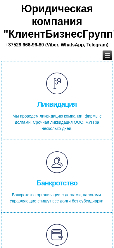 Название / Заголовок | Юридическая компания "КлиентБизнесГрупп". Юридические услуги. Банкротство компании / фирмы / ООО / ЧУП / Ликвидация фирмы / компании / ООО/ ЧУП с долгами |