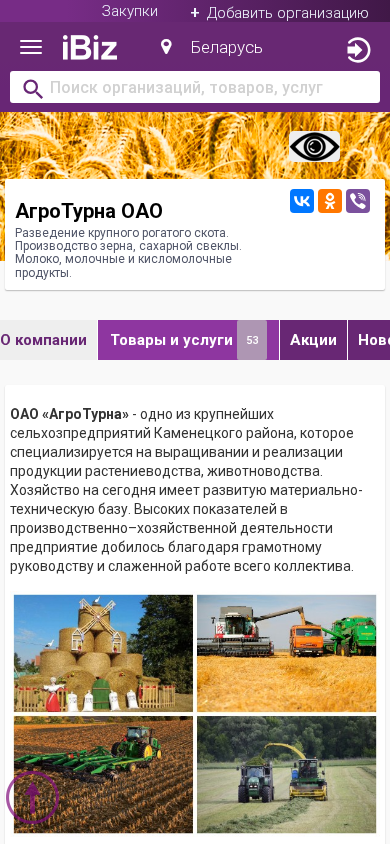 Название / ЗаголовокАгроТурна ОАО - Разведение крупного рогатого скота. Производство зерна, сахарной свеклы. Молоко, молочные и кисломолочные продукты.. 225053, , Большая Турна аг., Зеленый пер., 2