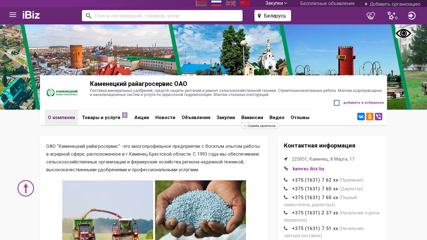 SEO-описаниеКаменецкий райагросервис ОАО - Поставка минеральных удобрений, средств защиты растений и ремонт сельскохозяйственной техники. Строительно-монтажные работы. Монтаж водопроводных и канализационных систем и услуги по окрасочной гидроизоляции. Монтаж стальных конструкций.. Схема проезда, контактные телефоны, адрес компании Каменецкий райагросервис ОАО. 225051, Каменец, , 8 Марта, 17