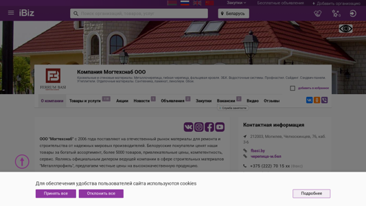 Название / Заголовок | Компания Могтехснаб ООО - Кровельные и стеновые материалы. Металлочерепица, гибкая черепица, фальцевая кровля. ЭБК. Водосточные системы. Профнастил. Сайдинг. Сэндвич-панели. Утеплители. Отделочные материалы. Сантехника, ламинат, линолеум. Обои.. 212003, Могилев, , Челюскинцев, 76, каб. 3-6 |