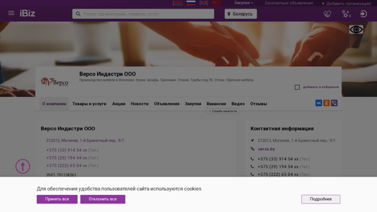Название / Заголовок | Версо Индастри ООО - Производство мебели в Могилеве. Кухни. Шкафы. Прихожие. Стенки. Тумбы под ТВ. Столы. Офисная мебель.. 212013, Могилев, , 1-й Брикетный пер., 9/1 |