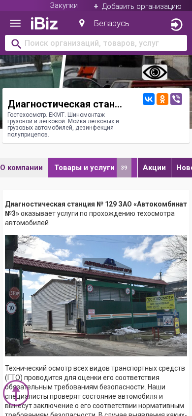 Название / Заголовок | Диагностическая станция № 129 ЗАО Автокомбинат № 3 - Гостехосмотр. ЕКМТ. Шиномонтаж грузовой и легковой. Мойка легковых и грузовых автомобилей, дезинфекция полуприцепов.. 220094, Минск, , Ванеева, 29 |