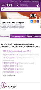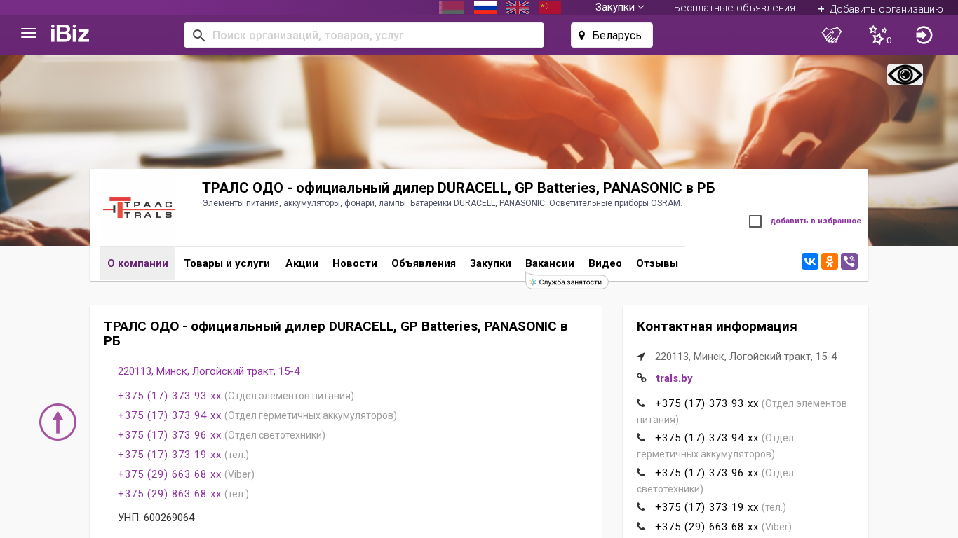 Название / Заголовок | ТРАЛС ОДО - официальный дилер DURACELL, GP Batteries, PANASONIC в РБ - Элементы питания, аккумуляторы, фонари, лампы. Батарейки DURACELL, PANASONIC. Осветительные приборы OSRAM.. 220113, Минск, , Логойский тракт, 15-4 |
